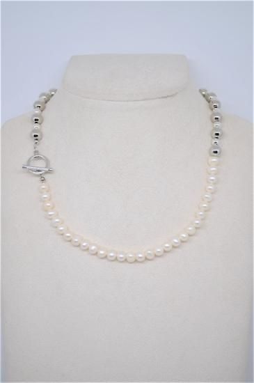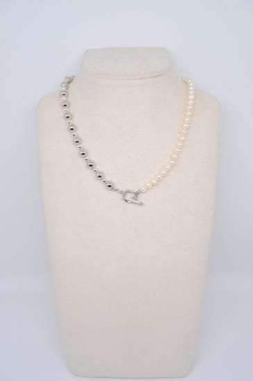 淡水パールとメタルボールの配色が絶妙なラリエット。